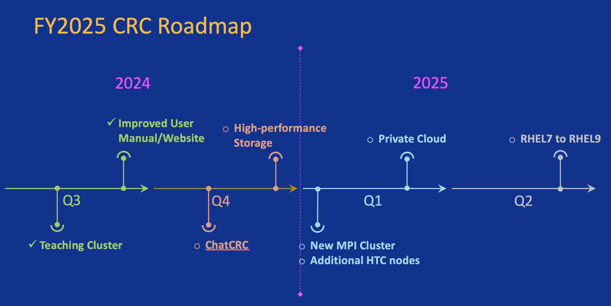 CRC is always working to improve our service and capabilities, and to innovate. During 2024, we distributed a survey specifically for MPI users and a wide-ranging survey for all users. We closely studied the feedback from our users and worked to correct the problems they encounter. Our roadmap for 2025 and beyond reflects listening to our users and responding to existing concerns, but also our team’s exploration of the forefront of computing such as generative AI.