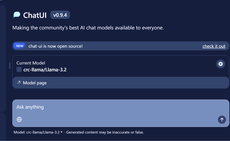 The chat interface is based on Hugging Face’s open-source ChatUI, offering a user-friendly, ChatGPT-style experience with support for chat history. If you are looking for quick answers from the CRCD user manual, we encourage you to make use of this tool.